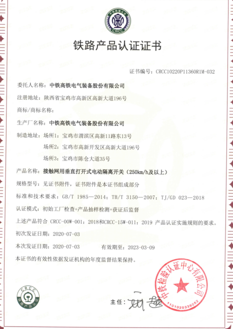 近日,从中铁检验认证中心传来喜讯,2007so太阳集团公司申请扩项的电动隔离开关顺利取得CRCC证书。电动隔离开关CRCC认证证书的取得,是公司产品...