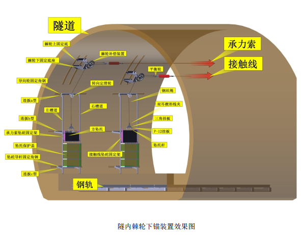 隧内棘轮下锚装置是隧道内接触网线索张力自动补偿装置的一种, 实现接触网在隧道内的机